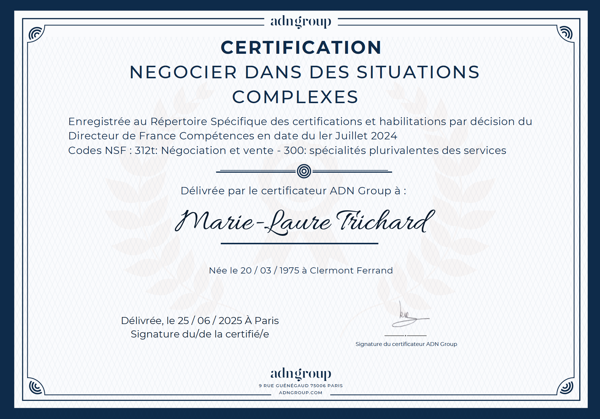 Dans la continuité de notre exigence et de notre quête d’excellence, ADN propose depuis 2024 la certification « Négocier dans des situations complexes » inscrite au Répertoire Spécifique de France Compétences. Cette reconnaissance officielle valide les compétences professionnelles mobilisées pour conduire avec rigueur, méthode et pragmatisme des négociations à forts enjeux.